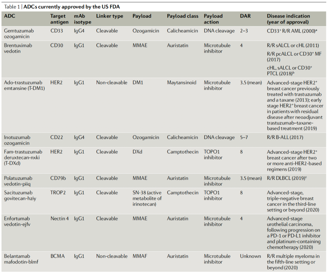 2011年,CD30靶向药物维布妥昔单抗(brentuximab vedotin)获批用于经典霍奇金淋巴瘤和系统性间变性大细胞淋巴瘤(ALCL)的治疗。不久之后在2013年,HER2靶向药物恩美曲妥珠单抗(adotrastuzumab emtansine,T-DM1)上市。自此,ADC研发的脚步逐渐加快。下表对已上市9款ADC做了个总结。