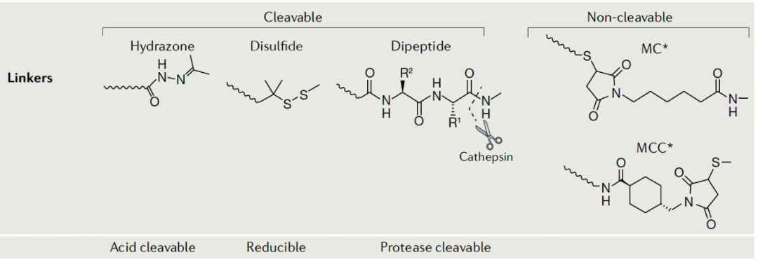 连接子大致分为两类:可切割型,不可切割型。当存在肿瘤相关性因素(例如:酸性环境,丰富的蛋白水解酶等)时,可切割型连接子能分解并释放ADC细胞毒性载荷。可切割型连接子有:PH敏感性腙连接子(例如:gemtuzumab ozogamicin),可还原性二硫键连接子,各种基于肽的连接子, 酶可切割型连接子(例如:维布妥昔单抗,polatuzumab vedotin,戈沙妥珠单抗,T-DXd等)。