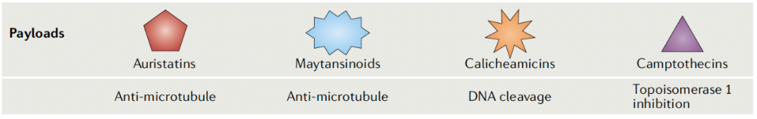 上面提到的获FDA批准的9个ADC中,单甲基auristatin E(MMAE)和单甲基auristatin F(MMAF)属于auristatins,是微管蛋白失稳剂。Ozogamicin属于calicheamicins,能导致双链DNA断裂。DM1属于美登素类化合物,能破坏微管蛋白的稳定性。最后,DXd和SN-38属于喜树碱衍生物,通过抑制拓扑异构酶I而导致DNA断裂。需要说明的是,这些载荷均不适合作为游离药物全身递送。