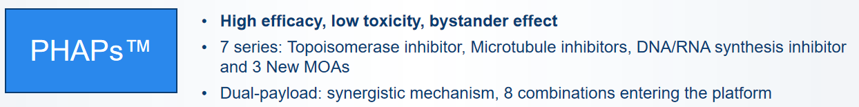 Adcoris has developed a library of proprietary highly active payloads (PHAPsTM) with a variety of MOA including microtubule inhibitors, TOP1 isomerase inhibitors, DNA/RNA synthesis inhibitors, etc, which are druggable with good bystander effects and can be used as ADC payloads or as a combination in dual payload ADC or bispecific ADC.